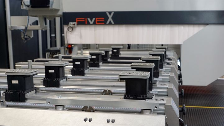 The solid gantry design combines helical gear racks on both sides of the machine column with two synchronous precision drives in the X direction.